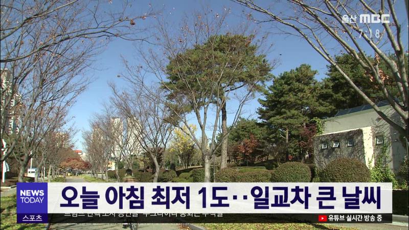 오늘(11\/20) 울산지방은 고기압의 영향으로 맑겠고 아침 최저 1도로 시작해 오후 들며 낮 최고 기온은 11도까지 오르겠습니다. 내일은 맑다 오후에 점차 구름 많겠으며 출근길 아침 최저기온 1도로 시작해 쌀쌀하겠고 한낮 기온은 15도로 일교차 여전히 큰 날씨가 예상됩니다. 울산기상대는 내일(21) 낮부터 서쪽에서 따뜻...