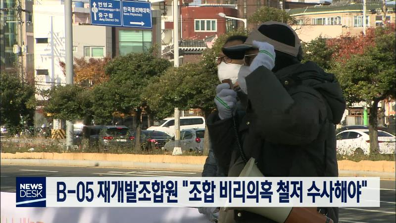 중구 B-05 구역 재개발주택조합 조합원들은 오늘(11\/19) 중부경찰서 앞에서 기자회견을 열고 최근 제기된 조합의 각종 비리 의혹에 대한 철저한 수사를 요구했습니다. 이들은 조합이 다른 사람의 명의를 도용해 분양권을 만들어내거나, 조합비를 부당하게 사용한 것으로 의심되는 정황이 많다며 엄정 수사를 요청하는 탄원...