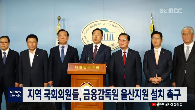 울산지역 국회의원들이 오늘(11\/18) 국회 정론관에서 기자 회견을 열고 금융감독원 울산지원 유치를 위해 정부 당국이 나서줄 것을 촉구했습니다. 이들은 특히 울산은 인구 10만명 당 보이스피싱 피해 건수는 전국 최고 수준을 기록하는 등 쵝느 3년간 울산지역의 금융 관련 민원이 지속적으로 증가하고 있지만, 울산에는 ...
