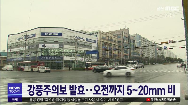 오늘(11\/18) 울산지방은 강풍주의보가 내려진 가운데 오전까지 5~20mm의 비가 내리겠고 한 낮엔 찬바람 불며 기온 뚝 떨어져 춥겠습니다. 내일은 구름 많겠고 아침 최저 5도로 시작해 낮 최고 9도의 기온 분포로 평년보다 다소 쌀쌀한 날씨가 예상됩니다. 울산기상대는 오늘 늦은 오후까지 10~16m\/s의 매우 강한 바람이 ...