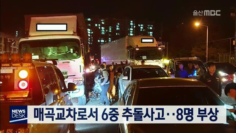 어제(11\/15) 저녁 7시 50분쯤 북구 오토밸리로 매곡교차로에서 대형 트럭이 승용차를 추돌했습니다. 이 사고로 승용차가 앞으로 밀리면서 모두 7대의 차량이 연쇄적으로 충돌해 운전자와 동승자 등 8명이 다쳐 병원으로 옮겨졌습니다. 경찰은 트럭이 신호를 기다리던 승용차를 뒤에서 들이받은 것으로 보고 정확한 사고 경...