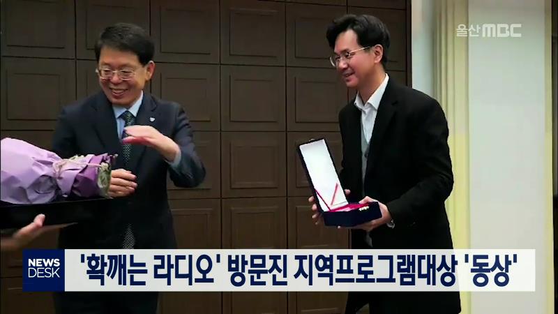 울산MBC 라디오프로그램 ‘확 깨는 라디오’가 2019 방송문화진흥회 지역프로그램 대상 시상식에서 동상을 수상했습니다. 이관열아나운서와 이남미씨가 진행하는 확 깨는 라디오는 두 진행자의 구수하고 친근한 말투와 서민들의 생활이 잘 담고 있어 지역민에게 많은 사람을 받고 있습니다.\/\/