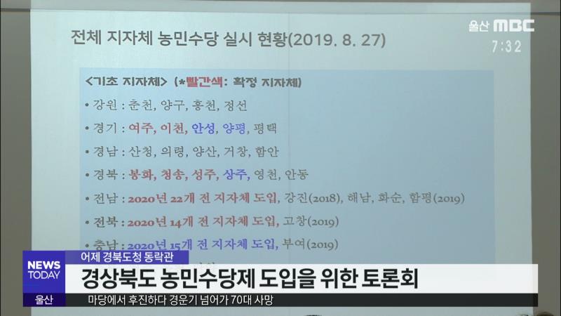 ◀ANC▶ 농업의 공익적 가치를 인정해 이를 수당으로 지급하는 '농민 수당' 도입이 전국적으로 확산하고 있는데요. 경상북도 농민들이 전남·북이나 충남처럼 농민수당 도입을 추진해야 한다는 목소리가 나오고 있습니다. 안동 성낙위 기자 ◀END▶ ◀VCR▶ 전남 강진과 해남에서 시작된 농민 수당 도입이 전국으로 확산...