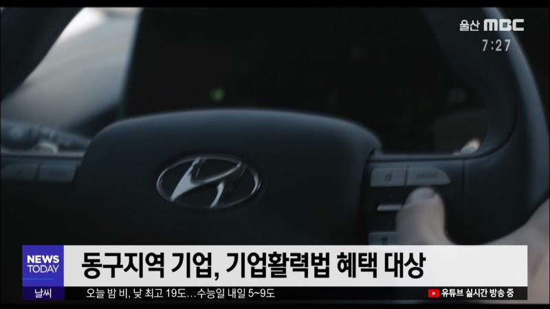 ◀ANC▶ 기업활력법 개정안이 오늘(11\/13)부터 시행됩니다. 산업위기특별구역으로 지정된 울산 동구지역 기업들도 대상에 포함됩니다. 아파트 가격이 8주째 상승하고 있지만 동구만 홀로 하락했습니다. 경제브리핑, 김문희 기잡니다. ◀END▶ ◀VCR▶ 지난 8월에 개정된 기업활력법은 자율주행차와 인공지능, 의료기기,...
