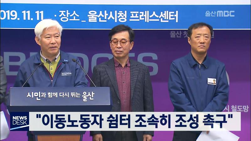 울산사회연대노동포럼은 오늘(11\/11) 울산시청 프레스센터에서 기자회견을 열고 이동노동자를 위한 쉼터를 조속히 조성할 것을 촉구했습니다. 이 단체는 서울과 경기도, 부산, 광주, 창원 등에서는 이미 쉼터를 개소했거나 올해 개소를 준비하고 있다고 설명했습니다. 반면, 울산시는 설립 취지에는 공감하지만 예산 투입 ...