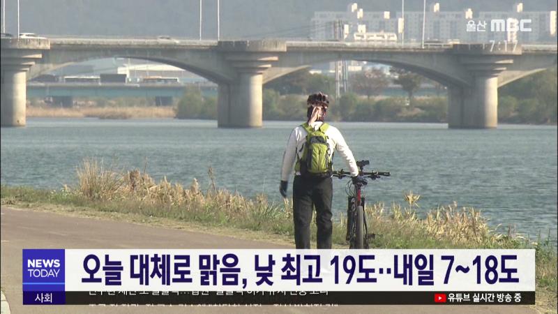 울산은 오늘(11\/12) 고기압의 영향을 받아 대체로 맑겠습니다. 낮 최고 기온은 19도로 예상돼 어제와 비슷하겠습니다. 내일은 차차 흐려져 밤에 5mm 내외의 비가 내리겠으며, 기온은 아침 최저 7도 낮 최고 18도의 분포를 보이겠습니다. 수능일인 모레는 맑은 가운데, 기온은 아침 최저 6도로 시작해 낮 최고 10도에 그쳐 ...