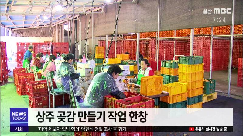 ◀ANC▶ 요즘 상주에서는 감을 깎고 말리는 곶감 만들기 작업이 한창입니다. 집집마다 주홍색의 감타래 물결이 장관을 이루고 있는 곶감 마을을 안동 성낙위 기자가 다녀왔습니다. ◀END▶ ◀VCR▶ 상주시 연원동 곶감 마을입니다. 감을 깎는 작업장에는 갓 따온 상주 '둥시'감이 쉴새 없이 들어오고 들어온 감을 깎는 ...