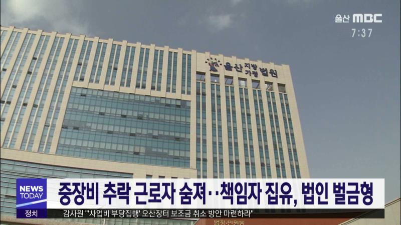 울산지법 형사3단독 김주옥 부장판사는 작업 근로자가 숨진 사건과 관련해 업무상과실치사 등 혐의로 재판에 넘겨진 토목공사 업체 대표 49살 A씨와 원청업체 현장소장 54살 B씨에게 징역 6개월에 집행유예 1년씩을 선고했습니다. 또 양벌규정에 따라 산업안전보건법 위반 혐의로 기소된 A씨 업체에 벌금 500만원, B씨 소속...