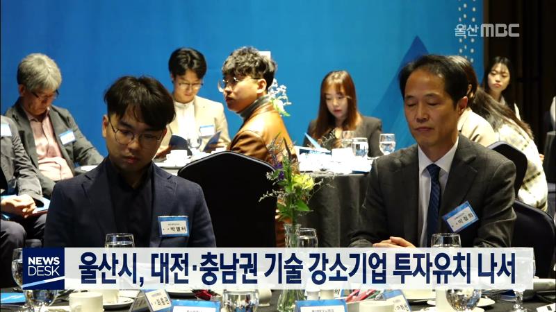 울산시는 오늘(11\/6) 대전에서 대전·충남권 기술 강소기업을 대상으로 투자설명회를 갖고 투자유치에 나섰습니다. 투자설명회에는 정보통신 11개사,바이오 9개사, 방송 통신 3개사, 에너지 10개사, 전자정보 2개사 등 35개사가 참여했습니다. 울산시는 울산 이전을 희망하는 기업에 공장 설립부터 연구개발, 생산, 판로 개...