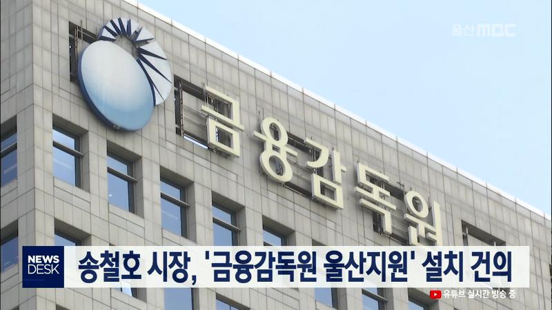 송철호 울산시장은 오늘(11\/6) 금융위원회와 금융감독원을 직접 방문해 금융감독원 울산지원 설치를 건의했습니다. 송 시장은 은성수 금융위원장과의 면담에서 울산은 광역시 중 유일하게 금융감독원 지원이 설치되지 않아 부산지원을 이용하는 불편을 겪고 있다며 협조를 당부했습니다. 한편 울산에서 발생하는 금융 민원...