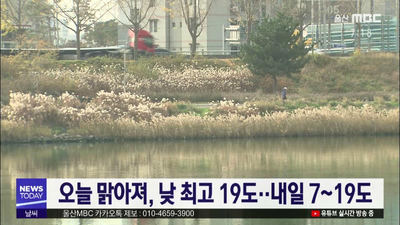 울산은 오늘(11\/7) 구름이 많다가 낮부터 고기압의 영향을 받으면서 차차 맑아지겠습니다. 낮 최고 기온은 19도로 예상돼 어제와 비슷하겠습니다. 입동인 내일은 새벽 한때 구름이 많다가 맑겠으며, 기온은 아침 최저 7도 낮 최고 19도의 분포를 보이겠습니다. 울산의 미세먼지 농도는 오늘과 내일 모두 '보통'으로 예보돼...