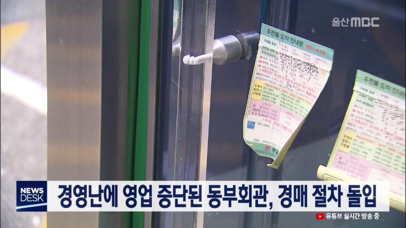 전기요금 미납 등 경영난으로 석달째 운영이 중단된 동구 동부회관이 경매 절차에 들어갔습니다. 법원경매정보에 따르면 최근 동부회관에 대한 경매가 접수돼 지난달 8일 한차례 유찰된 뒤 2차 매각 절차가 진행 중입니다. 동부회관은 앞서 지난 7월 경영난으로 3개월 치 전기요금과 직원 임금 등을 납부하지 못해 영업이 ...