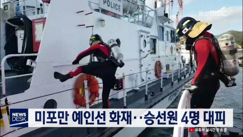 오늘(11\/4) 오후 2시 40분쯤 동구 미포만에서 정박중이던 해상 80톤급 예인선에서 불이 났습니다. 불이 나자 승선원 4명은 갑판으로 대피해 인명피해는 없었으며 울산해경과 동부소방서 등이 출동해 1시간 만에 화재를 진압했습니다. 울산해경은 예인 작업을 준비하던 중 냄새가 나서 배 안을 보니 연기가 차 있었다는 선...