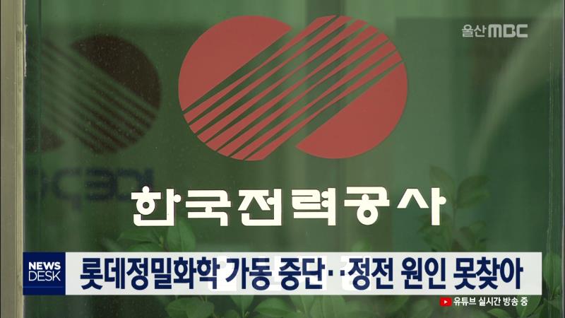 오늘(11\/4) 오전 10시 37분쯤 남구 매암동의 한 송전선로에서 정전이 발생해 롯데정밀화학의 공장 가동이 전면중단됐습니다. 한전 측은 선로에 문제가 생긴 것으로 보고 고장난 구간을 확인하기 위해 전수조사를 실시했지만 아직까지 원인을 파악하지 못했다고 밝혔습니다. 롯데정밀화학은 회사 자체 비상발전기로 폐수처...