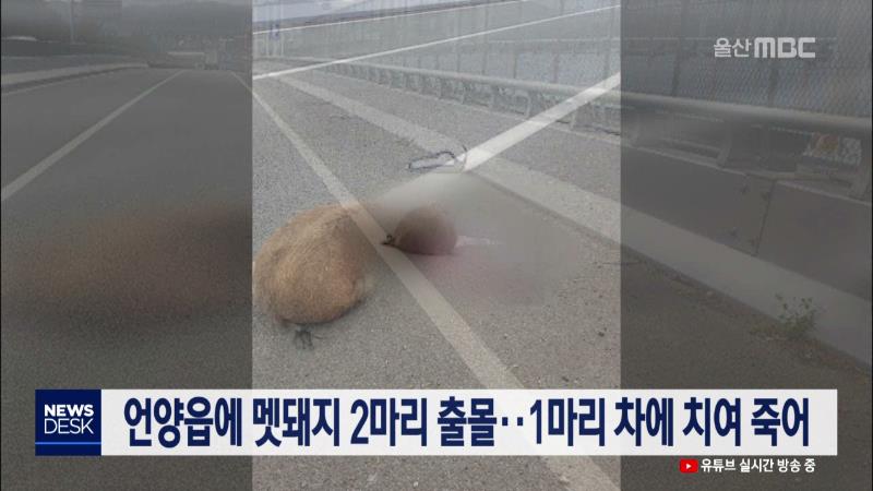 오늘(11\/4) 오전 9시 40분쯤 울주군 언양읍 국도 35호선 인근의 한 식당 앞 도로에 멧돼지 2마리 출몰해 울주군이 멧돼지 포획에 나섰습니다. 울주군청은 도주하던 멧돼지 2마리 중 한마리는 차에 치여 죽었고, 나머지 한마리는 삼남면 방면으로 이동해 추적하고 있다고 밝혔습니다. \/\/