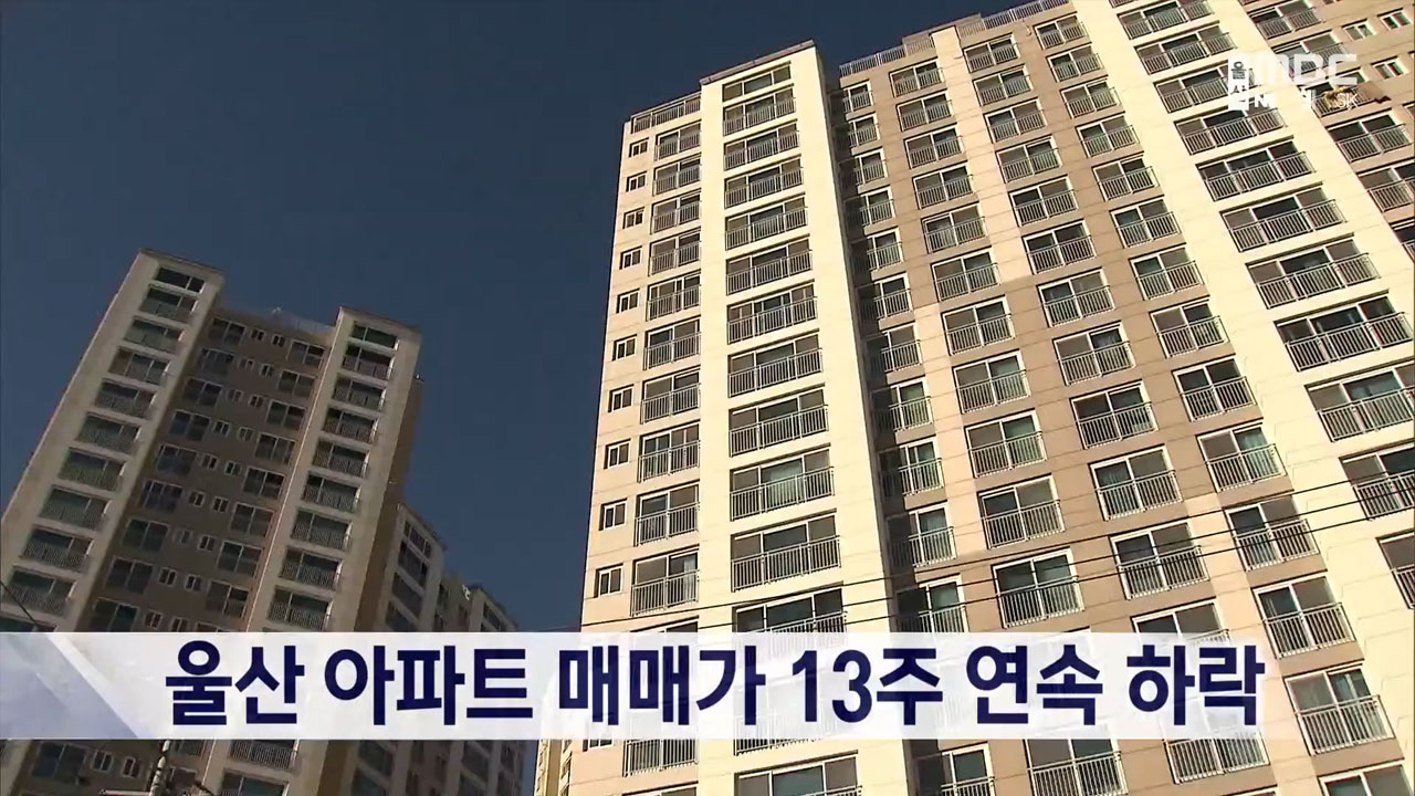울산지역의 아파트 매매가격이 13주 연속 하락세를 보이고 있습니다.한국부동산원에 따르면 11일 기준 울산의 아파트 매매가격은 전주대비 0.02% 하락해13주 연속 내렸습니다.구·군별로는 북구의 하락률이 0.04%로 가장 컸으며, 이어 남구·동구 -0.03%, 울주군 -0.02%등의 순을 보였고 중구만 유일하게 0.01% 상승했습니다.