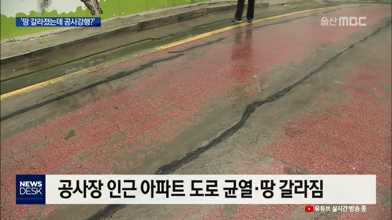◀ANC▶울산 남구의 한 아파트 주민들이아파트 인근에서 이뤄지는 공사 때문에피해를 호소하고 있습니다.크고 작은 균열에 이어,땅이 벌어지는 현상까지 나타났는데요.시공업체는 공사로 인한 피해는 인정하지만건물 안정성에 문제가 없어 예정대로 공사를진행하겠다는 입장입니다.김문희 기자. ◀END▶ ◀VCR▶울산 남...