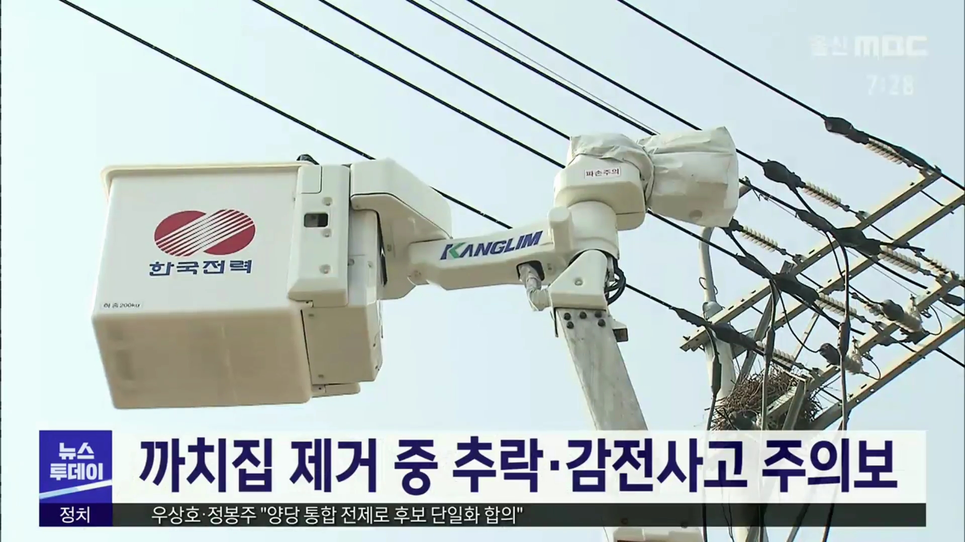 전신주 위에서 진행하는 까치집 제거 작업에