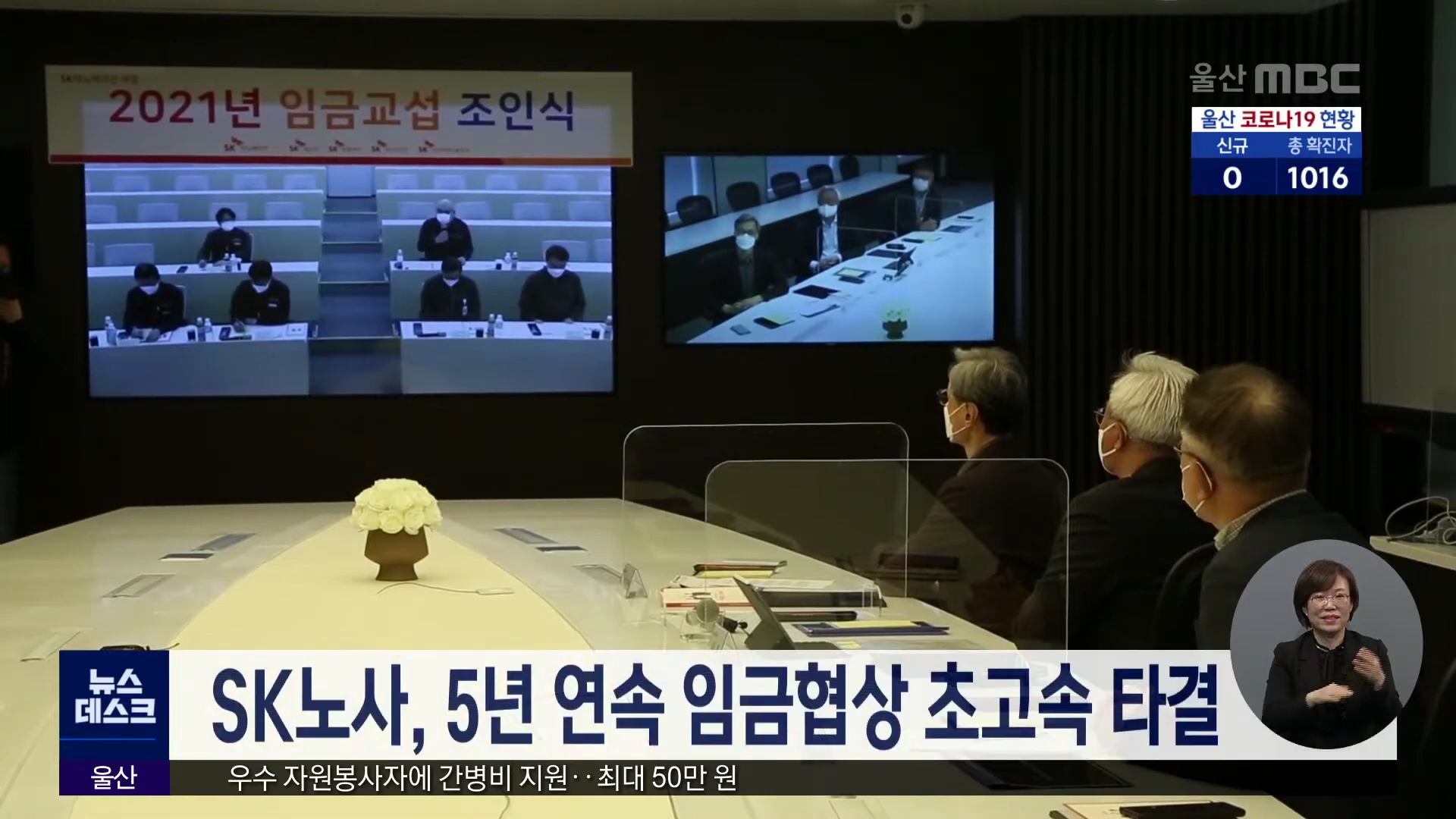 화상으로 임금교섭 조인식을 가졌습니다.