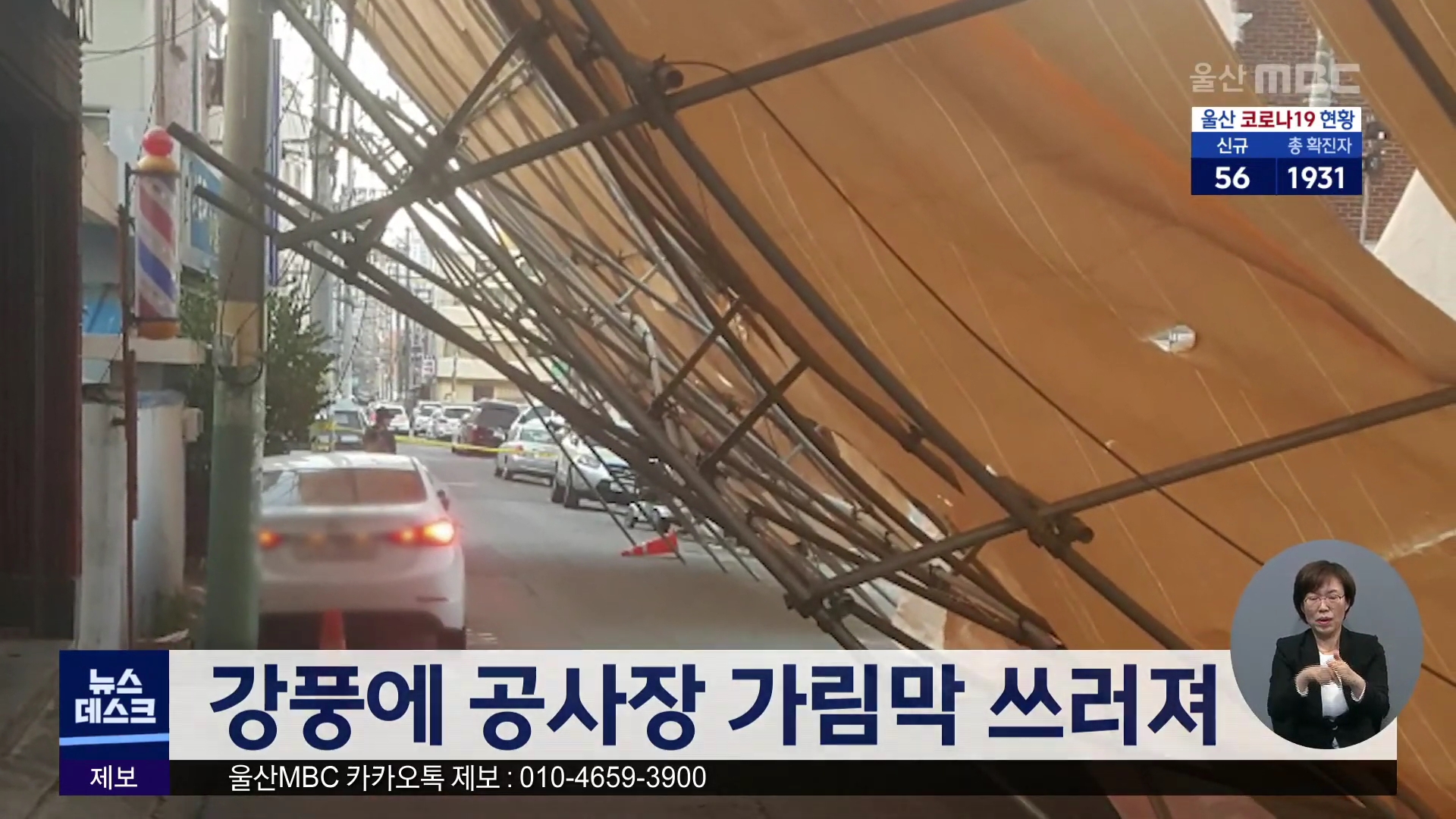 한 공사장에 세워진 가림막이 강풍으로 쓰러져