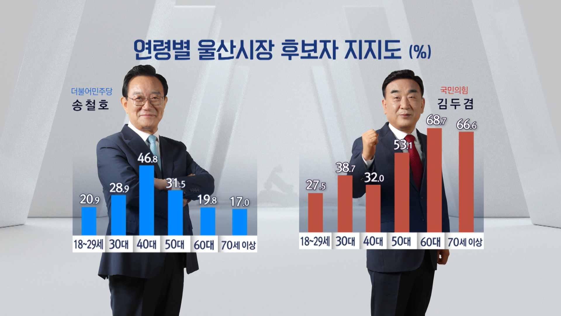 성별 지지율을 보면 전체적으로는 김두겸 후보가 앞섰습니다. 송철호 후보의 경우 여성 지지도가 조금 더 높았고, 김두겸 후보는 남성 지지도가 특히 높은 것으로 나타났습니다.