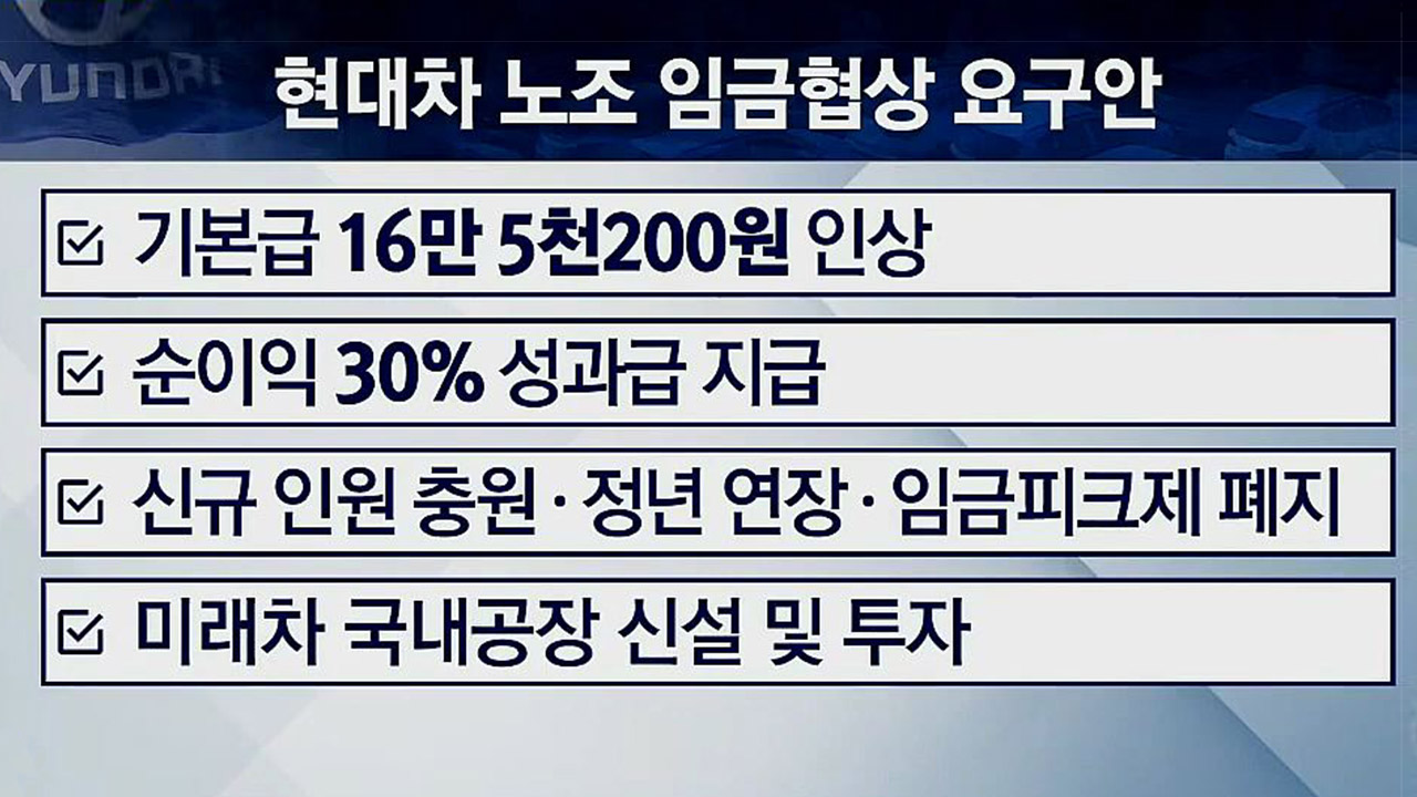 주요 쟁점들마다 노사의 입장 차가 워낙 컸기 때문에 쉽게 그 간격을 줄이기에는 힘들 것이다... 이런 예상이 가능했던 거죠. 지난 5월부터 노사가 임금협상을 진행해왔는데요. 노조가 요구했던 것은요. △기본급 16만 5천200원 인상 △순이익 30% 성과급 지급 △신규 인원 충원 △정년 연장 △임금피크제 폐지 △미래차 국내공장 신설과 투자를 요구했습니다.