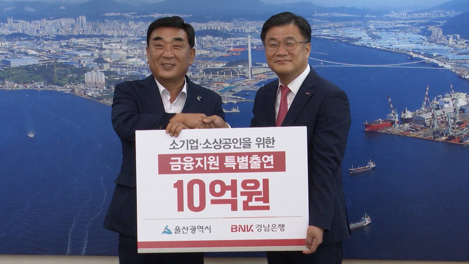 BNK경남은행이 코로나19로 어려움을 겪고 있는 울산지역 소기업과 소상공인을 위해 울산신용보증재단에 특별출연금 10억 원을 지원합니다.
