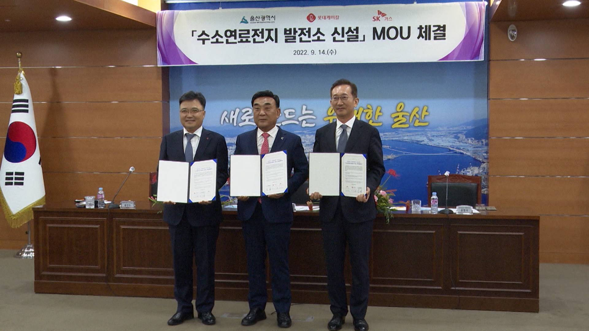 울산시는 오늘(9/14) 롯데케미칼 울산공장 부지 1만 2천㎡에 사업비 3천여억 원을 투입해 수소연료전지 발전소를 오는 2025년까지 짓는 계획이 담긴 투자양해각서를 롯데케미칼, SK가스와 체결했습니다.
