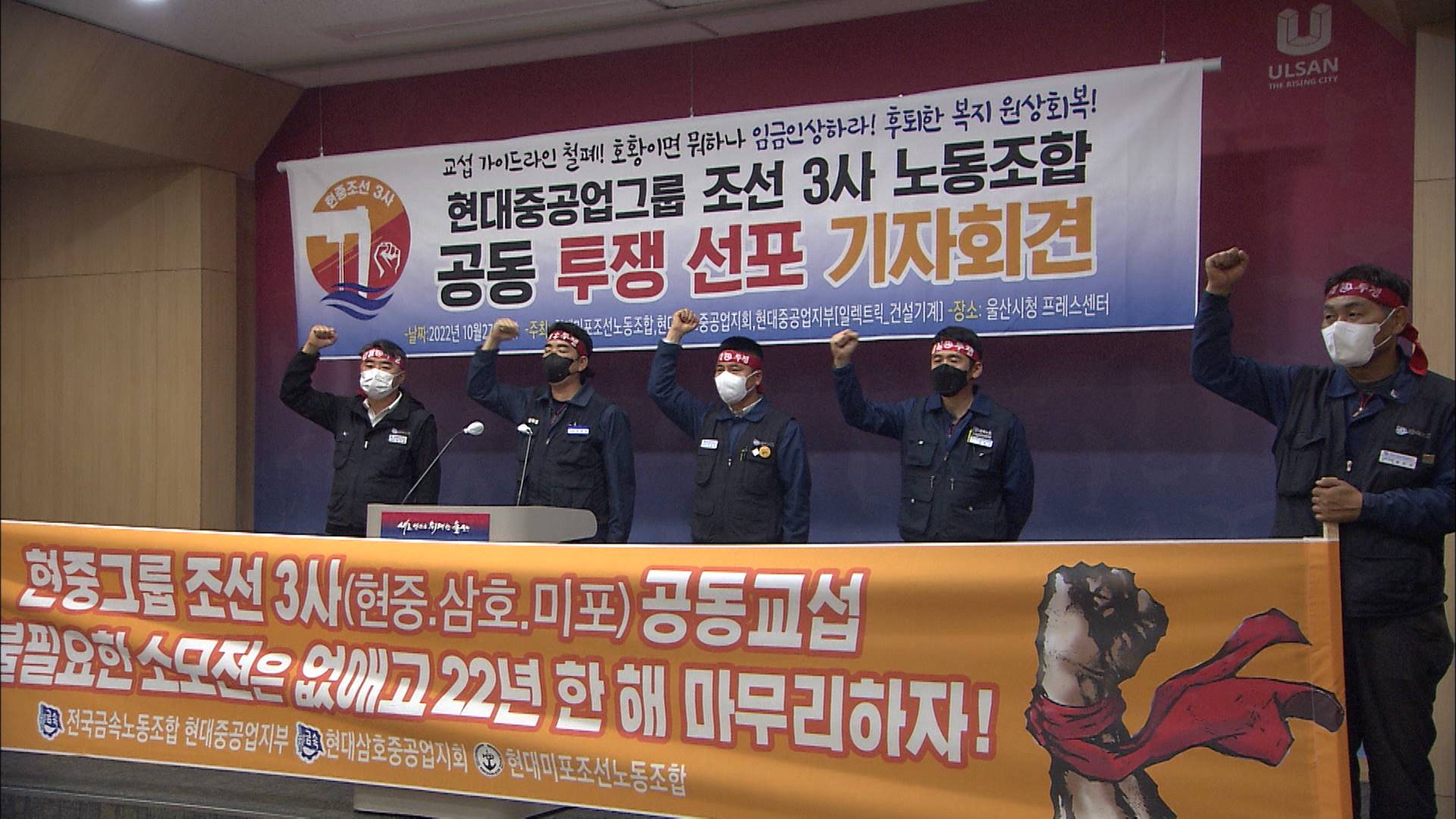 현대중공업 그룹 3사 노조는 오늘(10/27) 시청 프레스센터에서 기자회견을 열고 현대중공업에 빠른 교섭 타결 약속을 이행할 것을 요청했습니다.