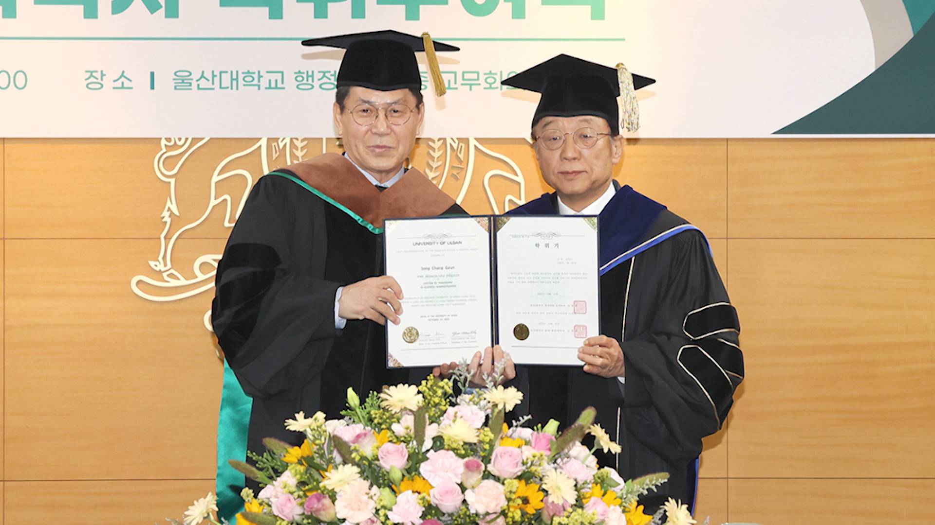 울산대가 오늘(10/31) 신발왕으로 불리는 KMK 글로벌스포츠그룹 송창근 회장에게 명예 경영학 박사학위를 수여했습니다.