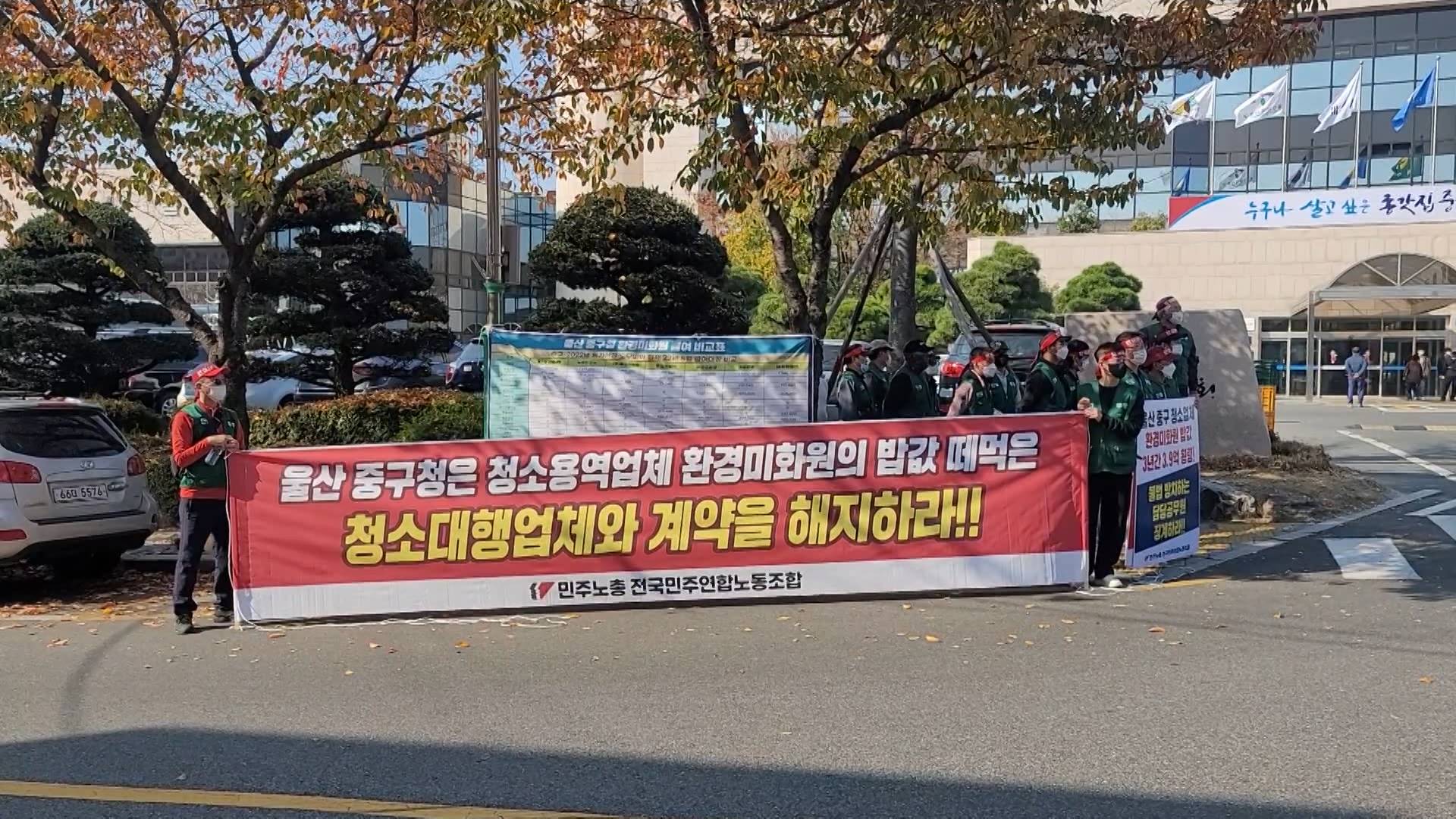 중구 지역 환경미화를 담당하는 청소용역업체 미화원들은 오늘(11/10) 중구청에서 기자회견을 열고 미화원 임금을 착복한 용역업체들에 대해 중구청이 조치해야한다고 주장했습니다.