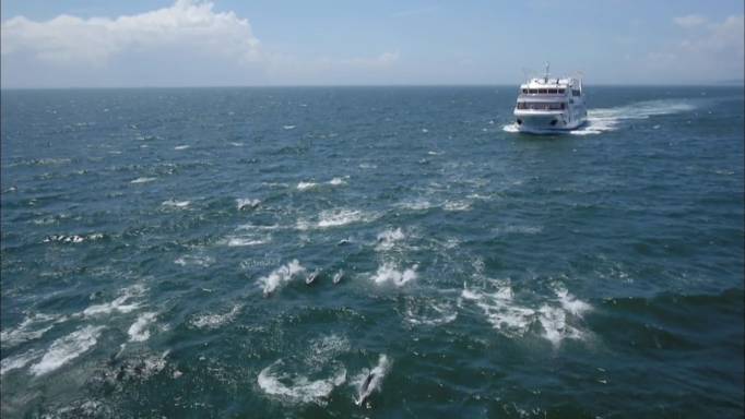 울산 남구 장생포에서 출발하는 고래바다여행선을 타고 울산앞바다에서 돌고래떼를 관광하는 모습