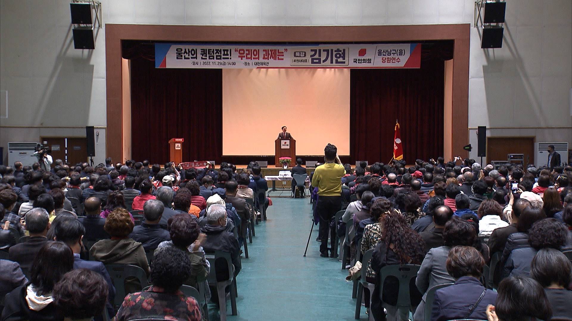 당대표 도전에 나선 국민의힘 김기현 의원이 오늘(11/25) 남구 대현체육관에서 당원교육을 겸한 특강에 나섰습니다.