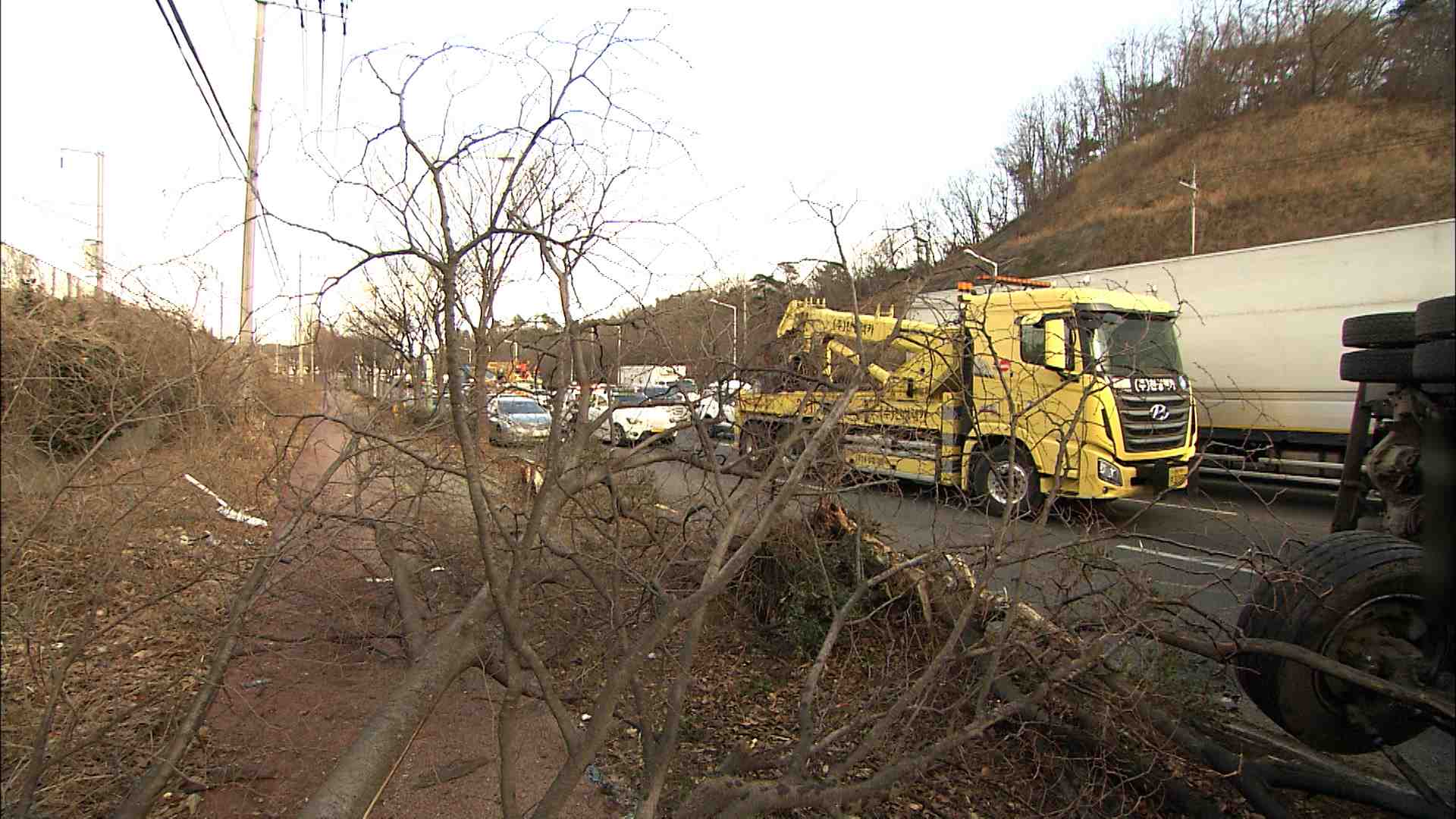 오늘(2/14) 오후 3시쯤 남구 상개저수지 근처 산업로를 달리던 21톤 화물차가 옆으로 넘어졌습니다.