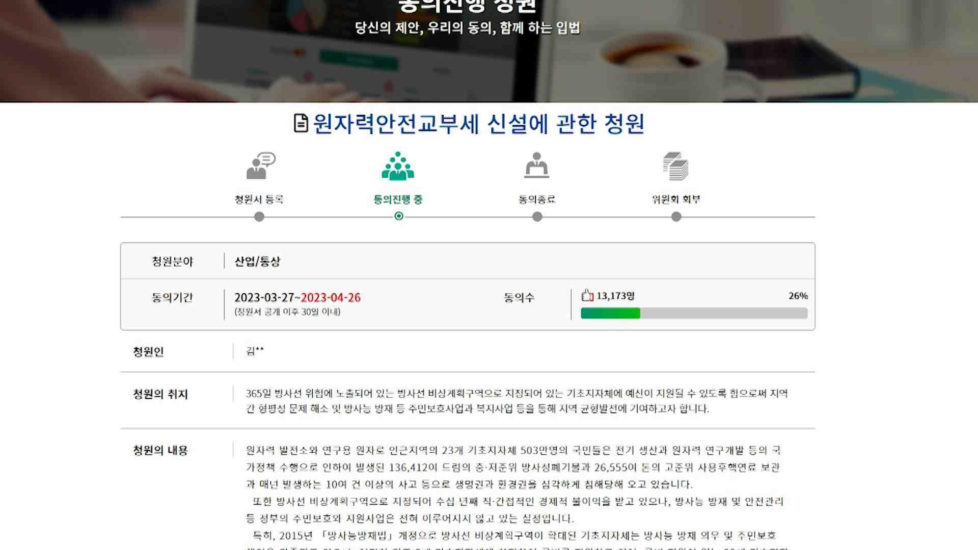 원전 인근 지자체에 원자력안전교부세를 주도록 하는 '지방교부세법 개정안 입법' 국민동의 청원 참여 인원이 청원 기준의 25%를 넘었습니다.