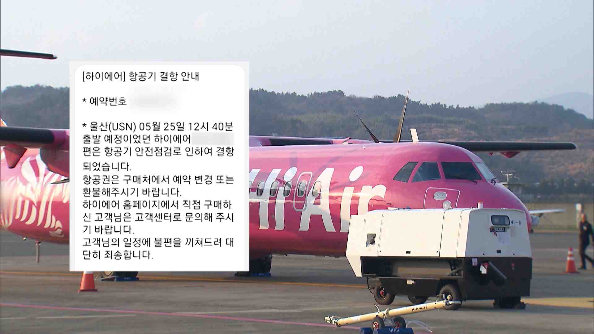 한국공항공사 울산지사에 따르면 어제(5/24) 오후 8시55분 울산공항에서 김포공항으로 출발하려던 하이에어 항공기가 안전 점검이 필요해 결항됐고,