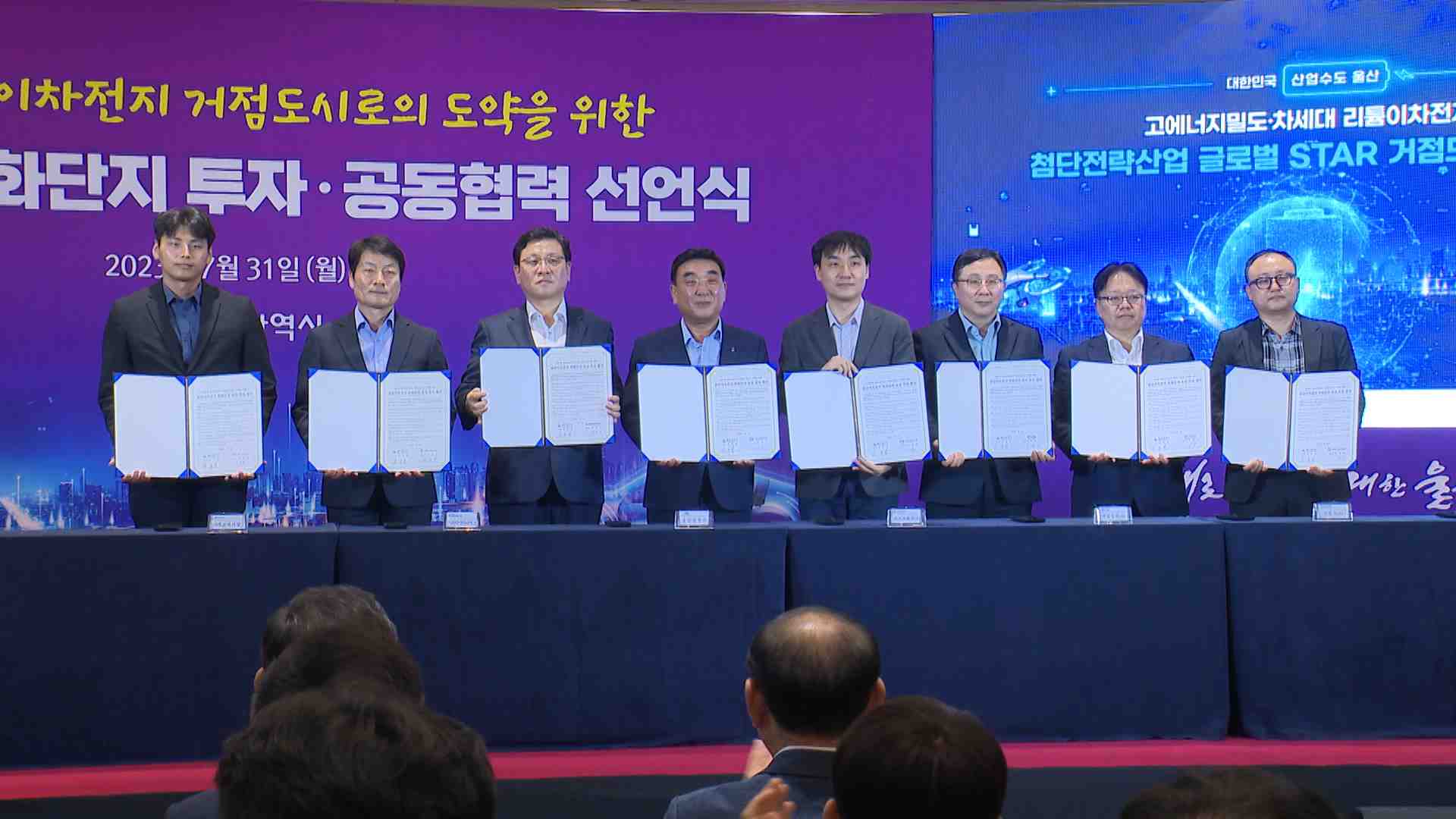 울산시는 오늘(7/31) 오후 울산시청 시민홀에서 혁신지원기관과 투자 선도기업 등 총 19개 산학연관이 참여하는 첨단이차전지 특화단지 투자·공동협력 선언식을 열었습니다.