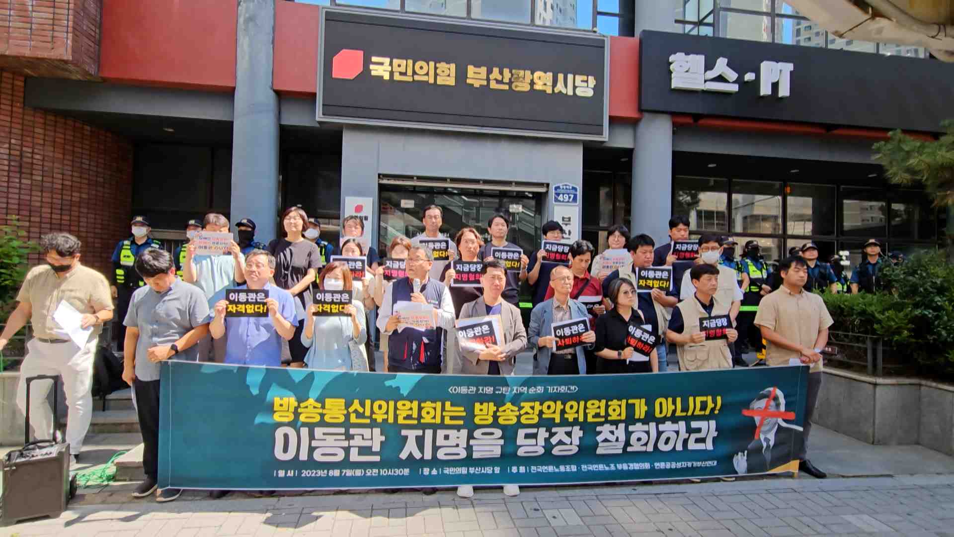부울경 13곳 언론노조와 8개 시민단체는 국민의힘 부산시당 앞에서 기자회견을 열고, "이명박 정권에서 반헌법적인 언론탄압을 진두지휘한 이동관 후보자가 방통위를 언론탄압의 도구로 쓰는 걸 용납할 수 없다"며 후보자 지명 철회를 촉구했습니다.