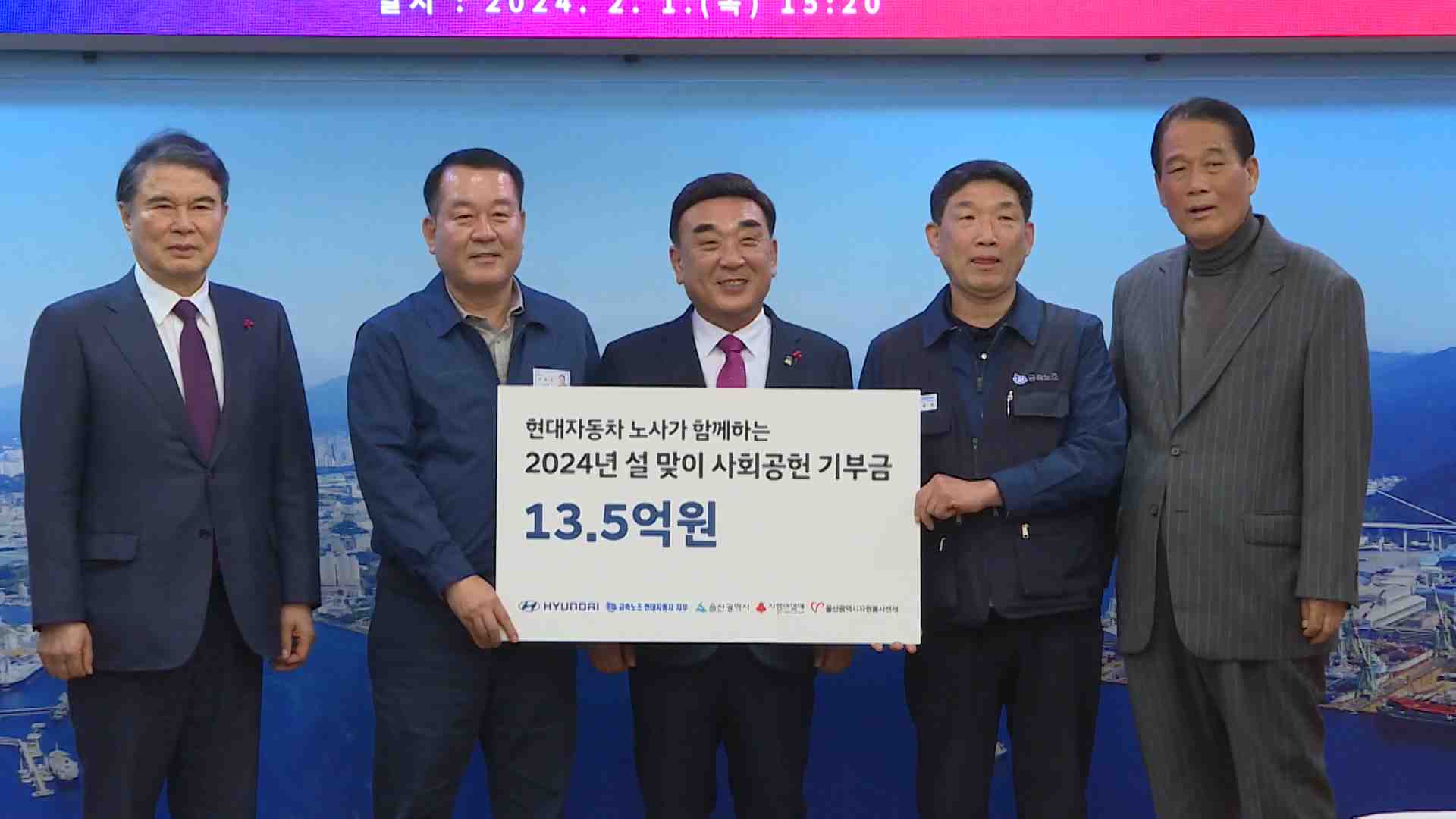 현대자동차 노사는 오늘(2/1) 울산시청에서 지역사회 공헌기금으로 13억 5천만 원을 전달했습니다.
