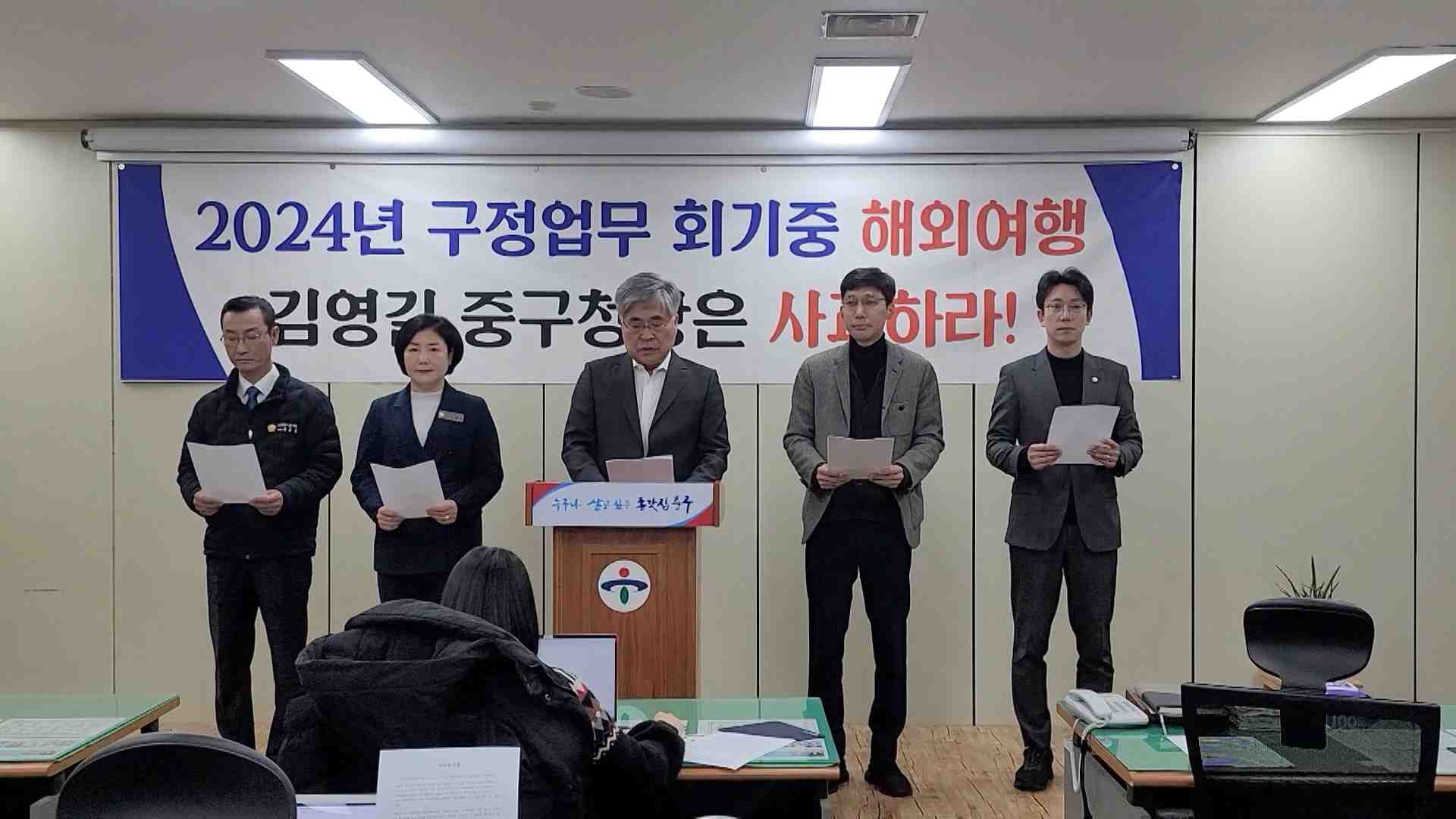 의원들은 김영길 중구청장이 지난 2022년부터 지금까지 의회 회기 중 각종 사유로 출국해 자리를 비우는 일이 수차례 있었다며, 구민의 대표로서 공식 사과해야한다고 주장했습니다.