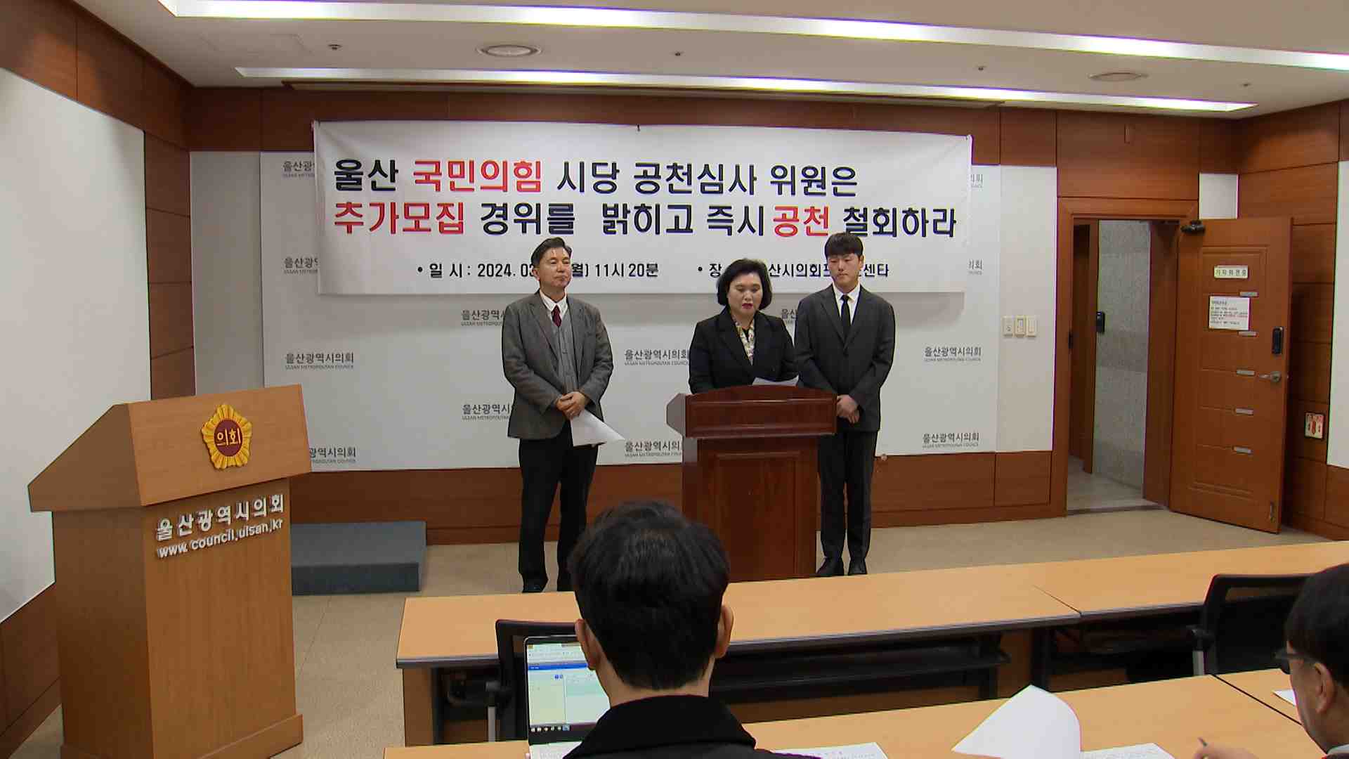 이들은 울산시당이 1차 모집에서 공천을 신청한 5명을 대상으로 면접을 진행해 놓고, 예정에 없던 2차 모집 공고를 낸 뒤 2명의 추가 모집자 가운데 1명을 단수 공천했다고 의혹을 제기했습니다.