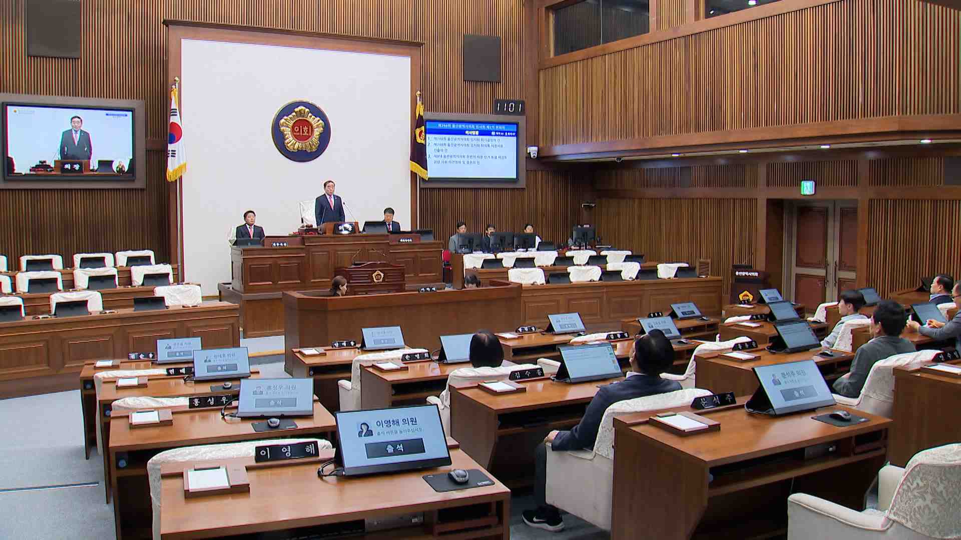 김기환 의장은 이틀 연속 본회의가 파행을 비자 직권으로 이성용 의원의 후반기 의장 당선을 취소하고 안수일 의원을 의장으로 결정한다고 선포했습니다.