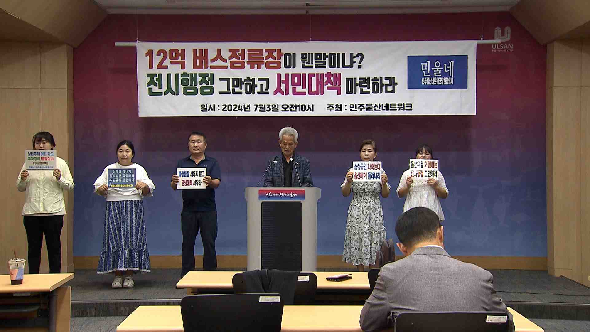 이들은 울산시가 시청 버스정류장 건설에 12억 원을, 조형물 건립 용역비에 5억 원을 지출하는 등 치적 쌓기에만 몰두하고 있다고 지적했습니다.