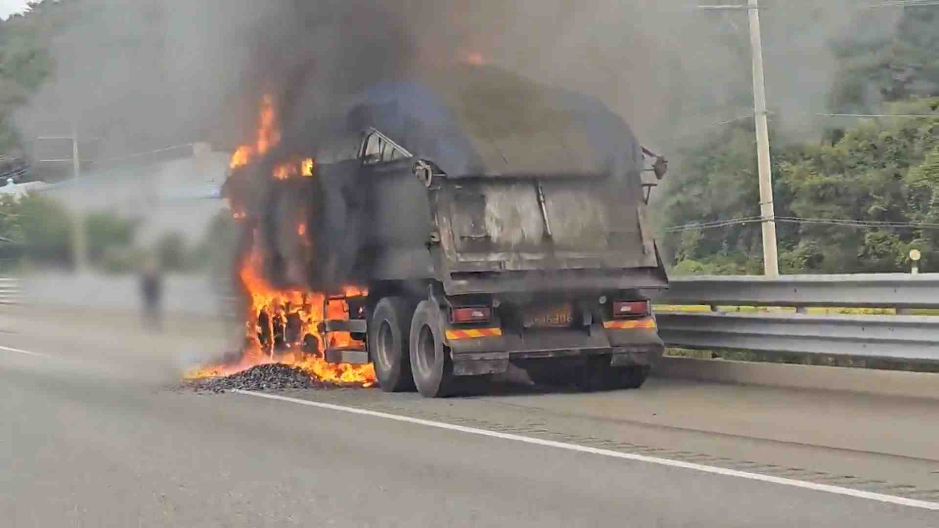 오늘(10/17) 낮 12시 40분쯤 울주군 두서면 경부고속도로 서울 방향에서 40대 운전자가 몰던 25톤 덤프트럭에서 불이 나 트럭과 적재된 철 스크랩을 태우고 출동한 소방대에 의해 약 35분 만에 꺼졌습니다.