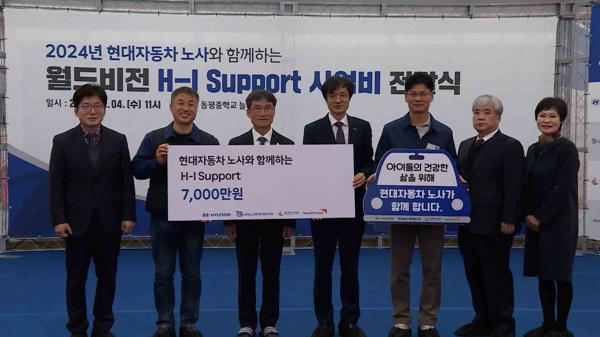 현대차 노사는 오늘(12/4) 남구 동평중학교에서 복지 사각지대에 있는 아동지원에 써 달라며 사회공헌기금 7천만 원을 국제구호개발 비정부기구 월드비전에 기탁했습니다.