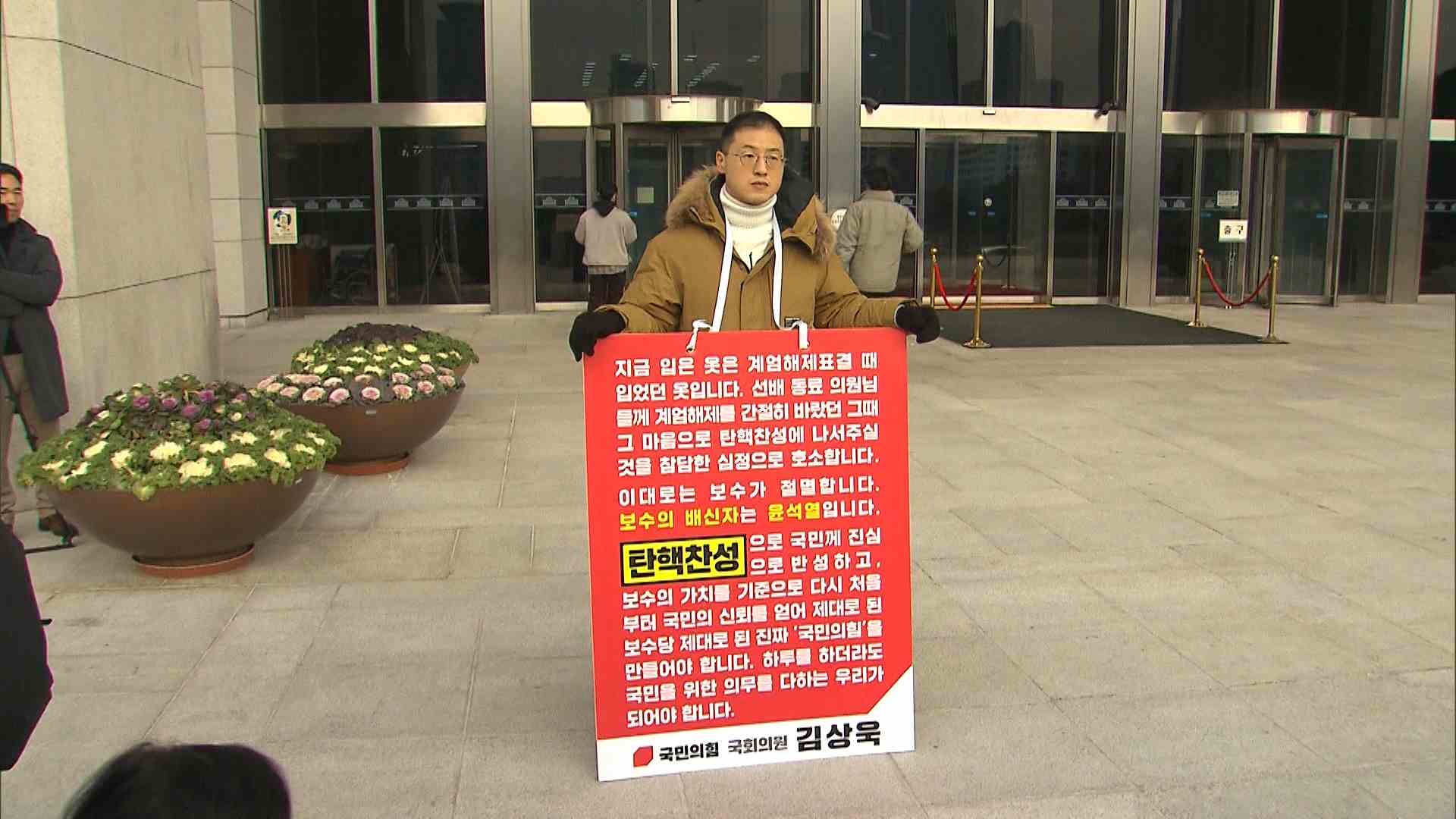 국민의힘 김상욱 의원이 국회 본관 앞에서 윤석열 대통령 탄핵소추안 찬성 표결 동참을 촉구하는 1인 시위에 나섰습니다.