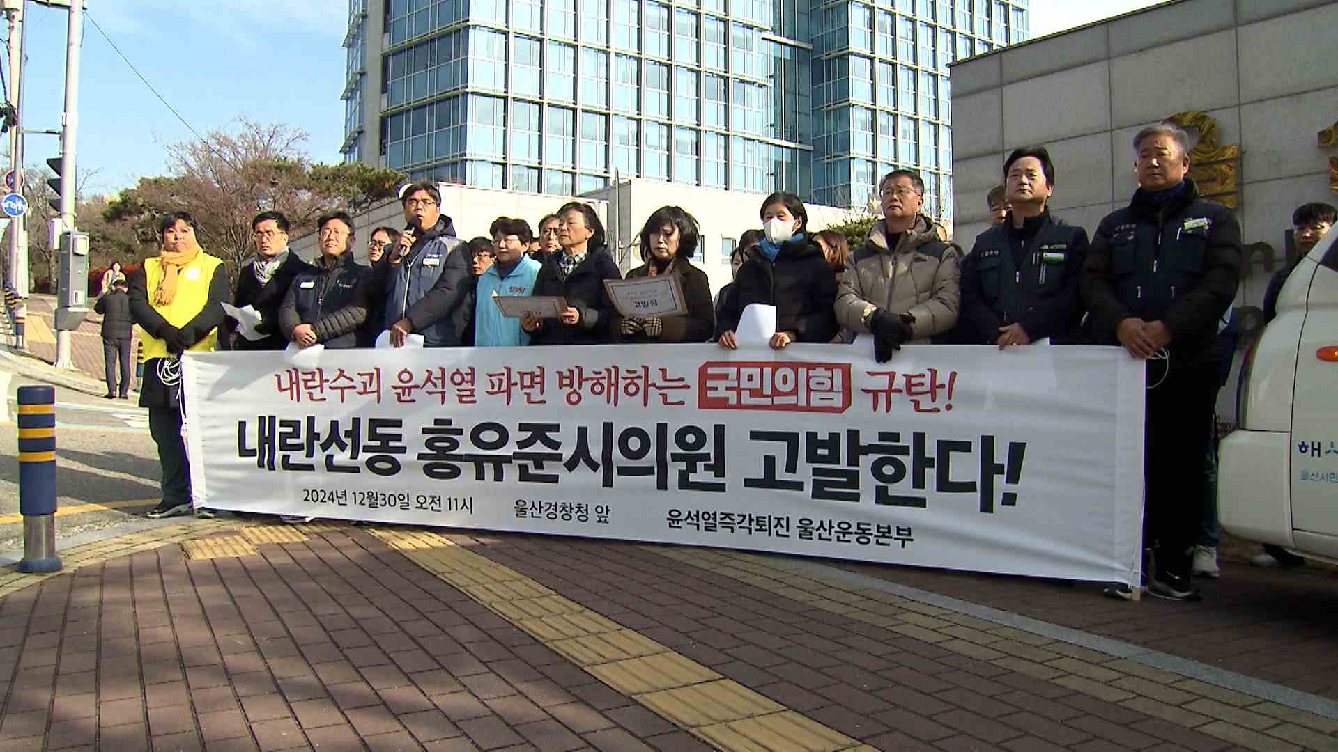 윤석열즉각퇴진 울산운동본부는 오늘(12/30) 국민의힘 소속 홍유준 울산시의회 의원을 내란 선동 혐의로 경찰에 고발했습니다.