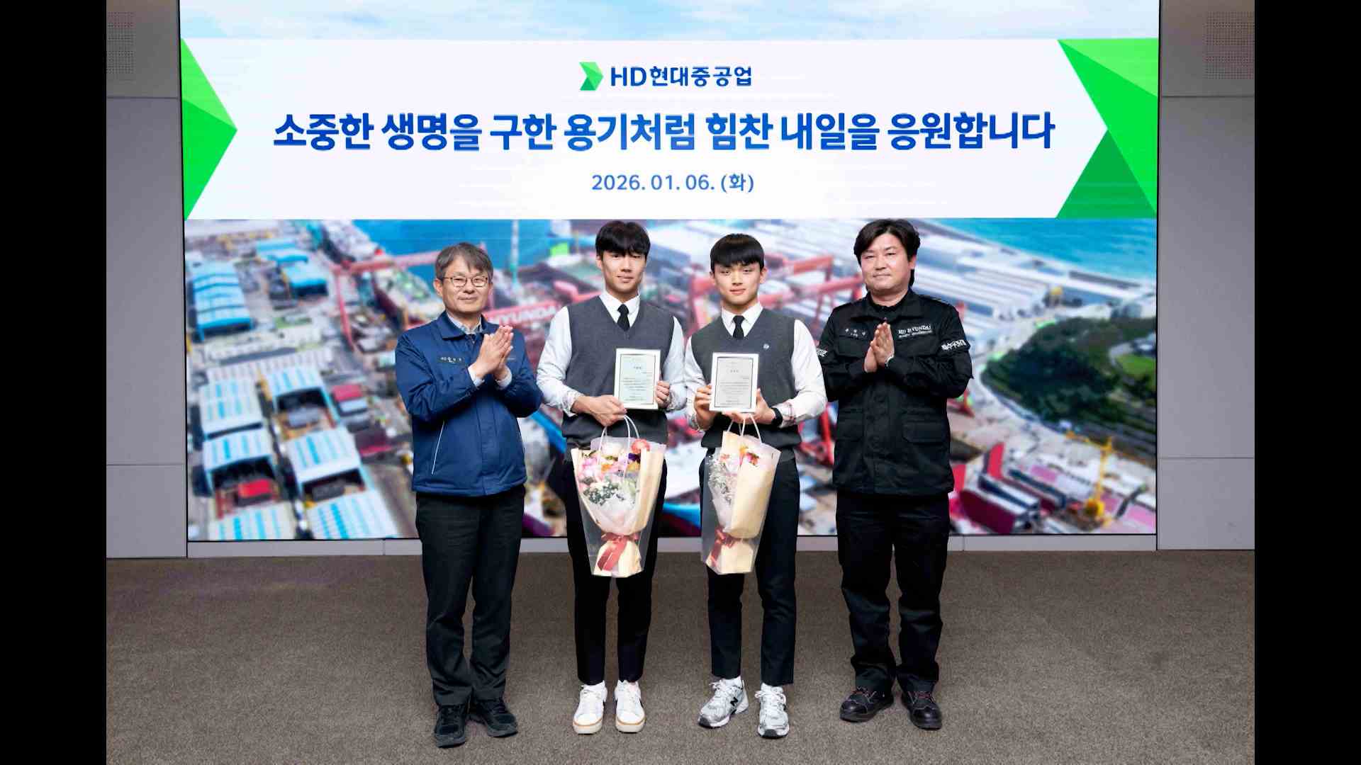 HD현대중공업이 최근 의식을 잃고 쓰러진 어르신의 생명을 구한 고등학생 윤재준, 문현서 군에게 표창장과 장학금을 전달했습니다.