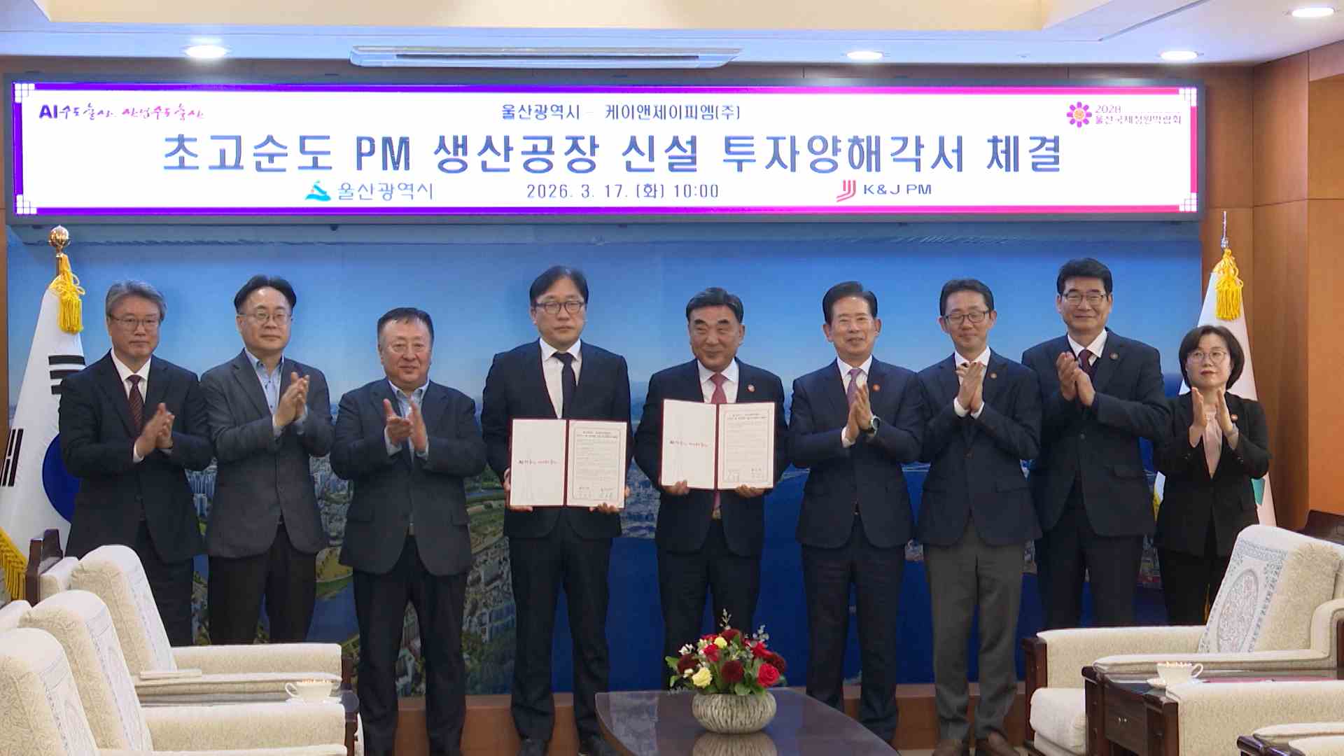 울산시와 정밀화학 기업 '케이앤제이피엠'이 반도체·디스플레이 공정용 세정제 생산공장 신설 투자양해각서를 체결했습니다.