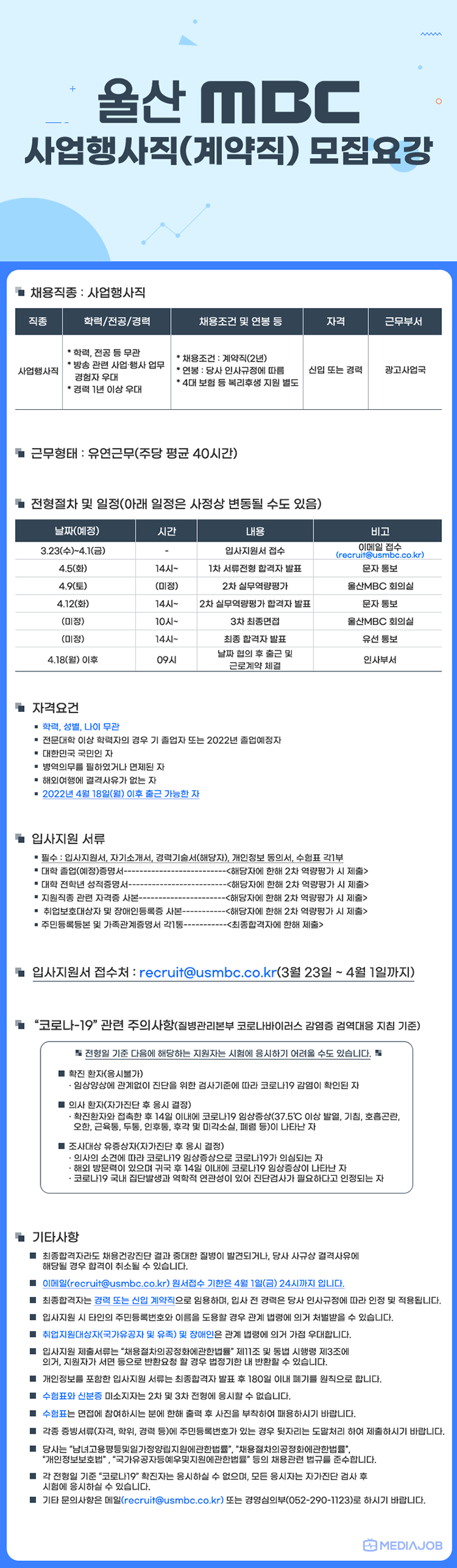 공지사항 2022 사업행사직(계약직) 채용 공고 등록일 : 2022-03-22 16:51 조회수 : 1008 ▶ 입사지원서 다운로드 ◀ 첨부파일 3R4rl3ZhtvBSr-2022_사업행사직_입사지원_양식.zip (28.20 KB) 다운로드 수정 삭제 이전글 다음글 목록